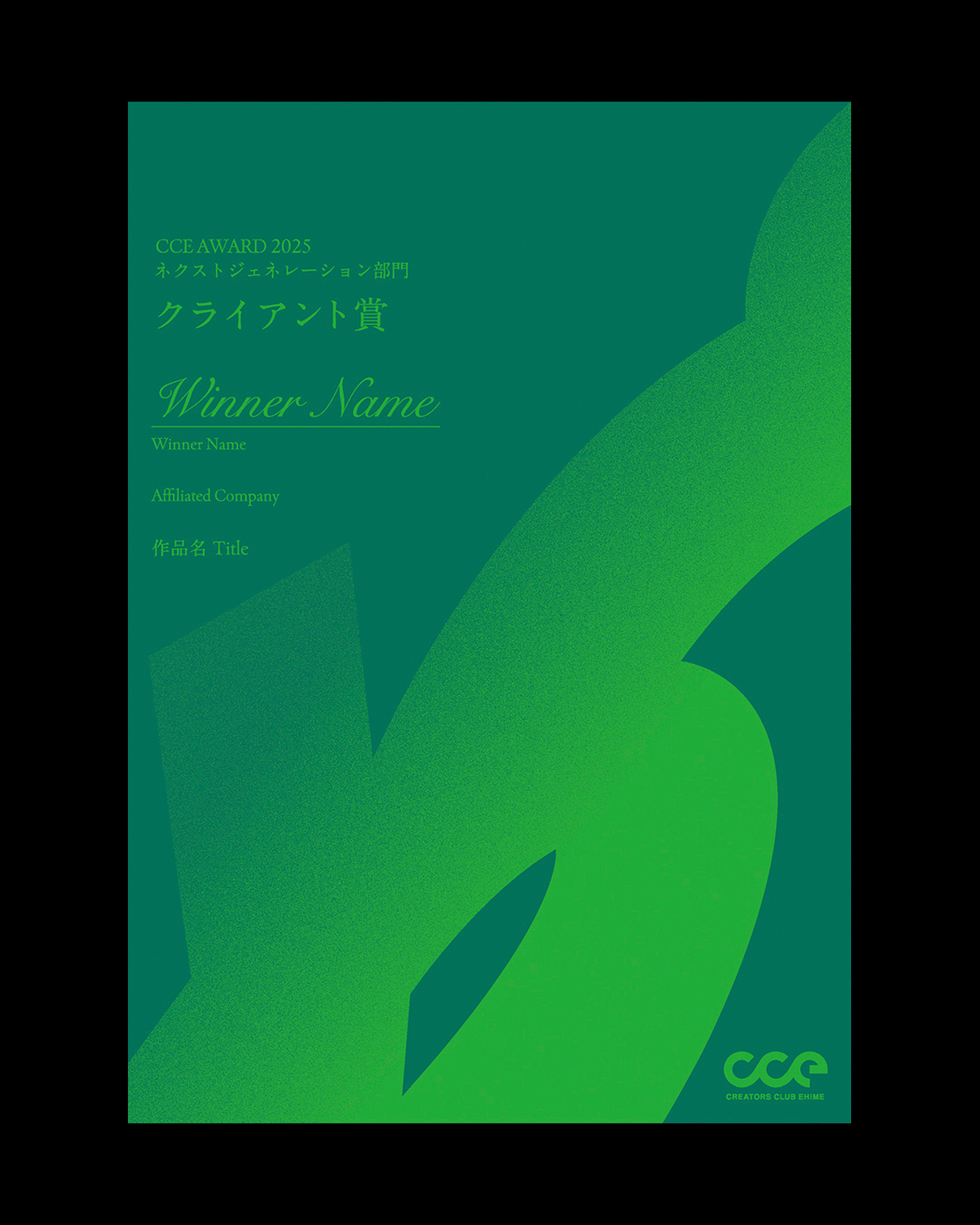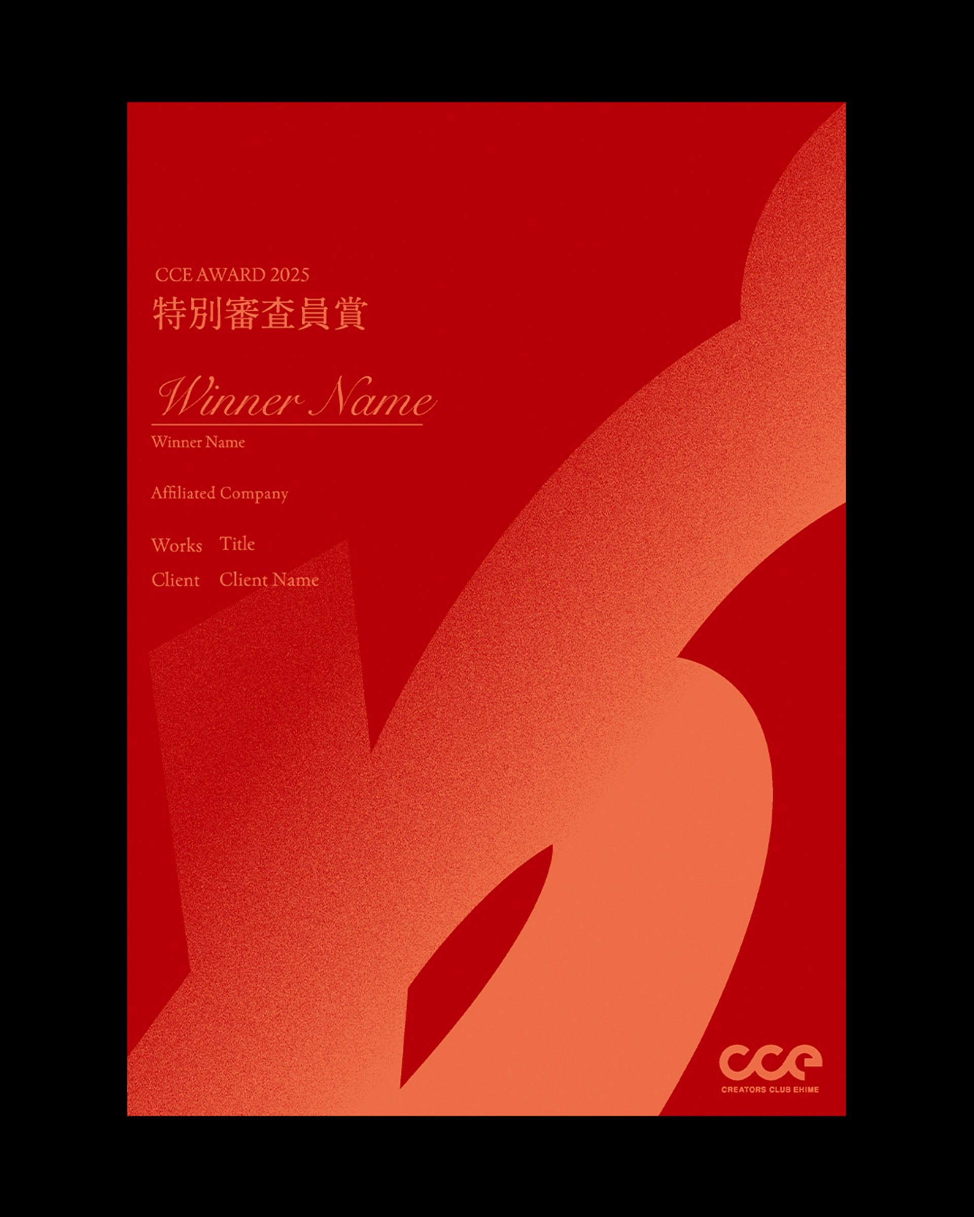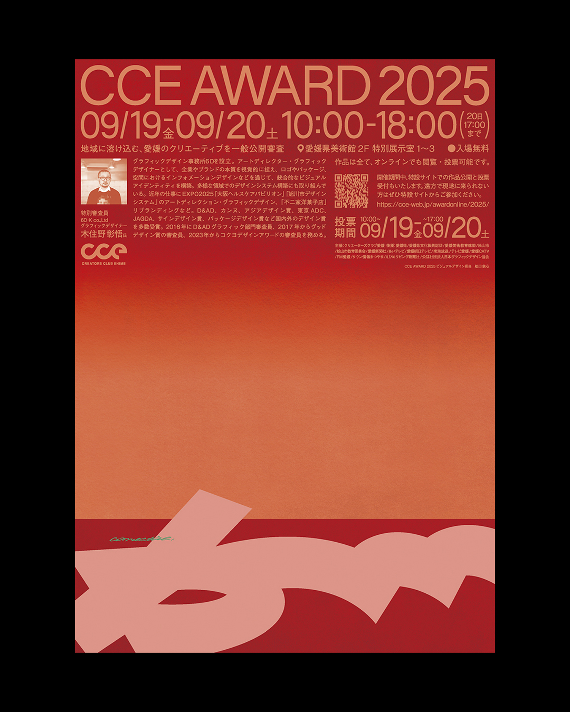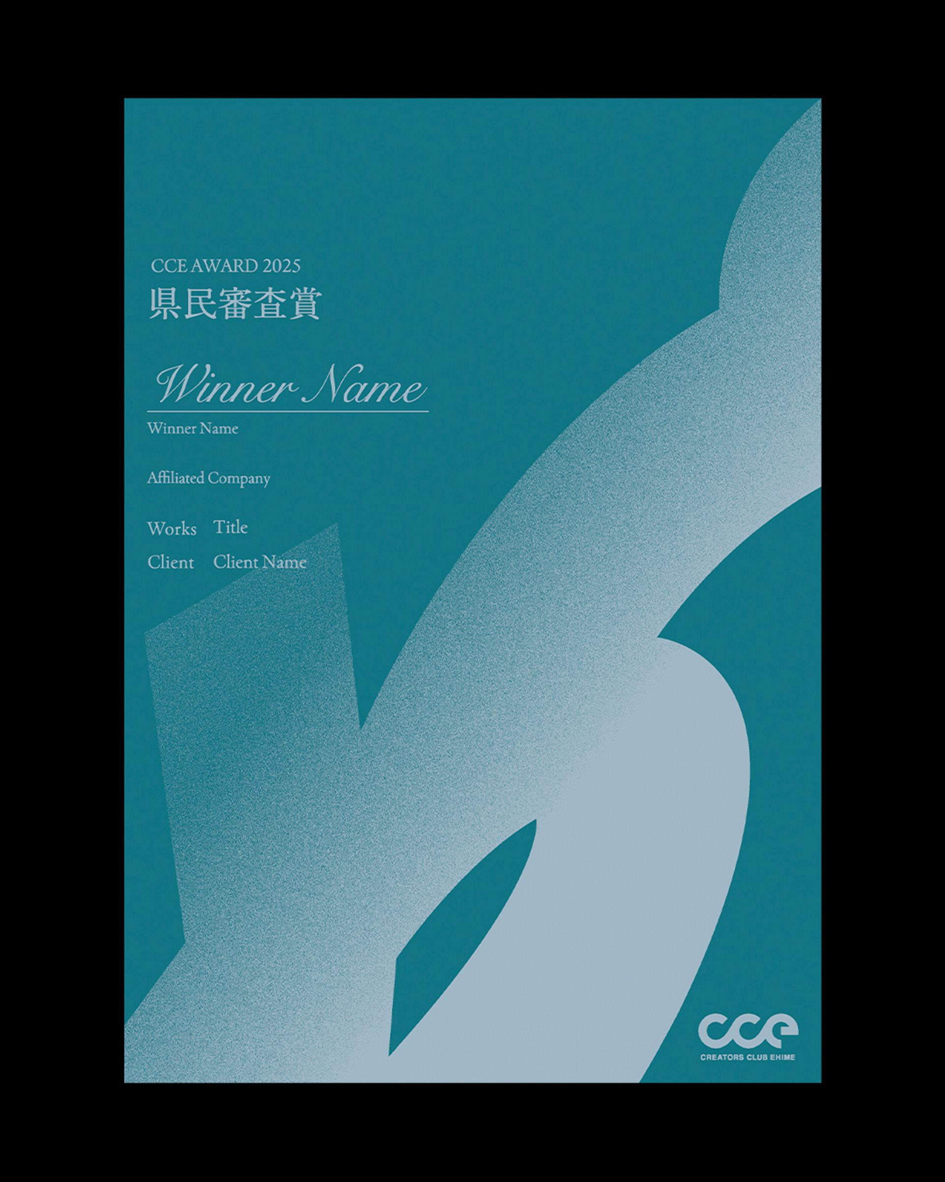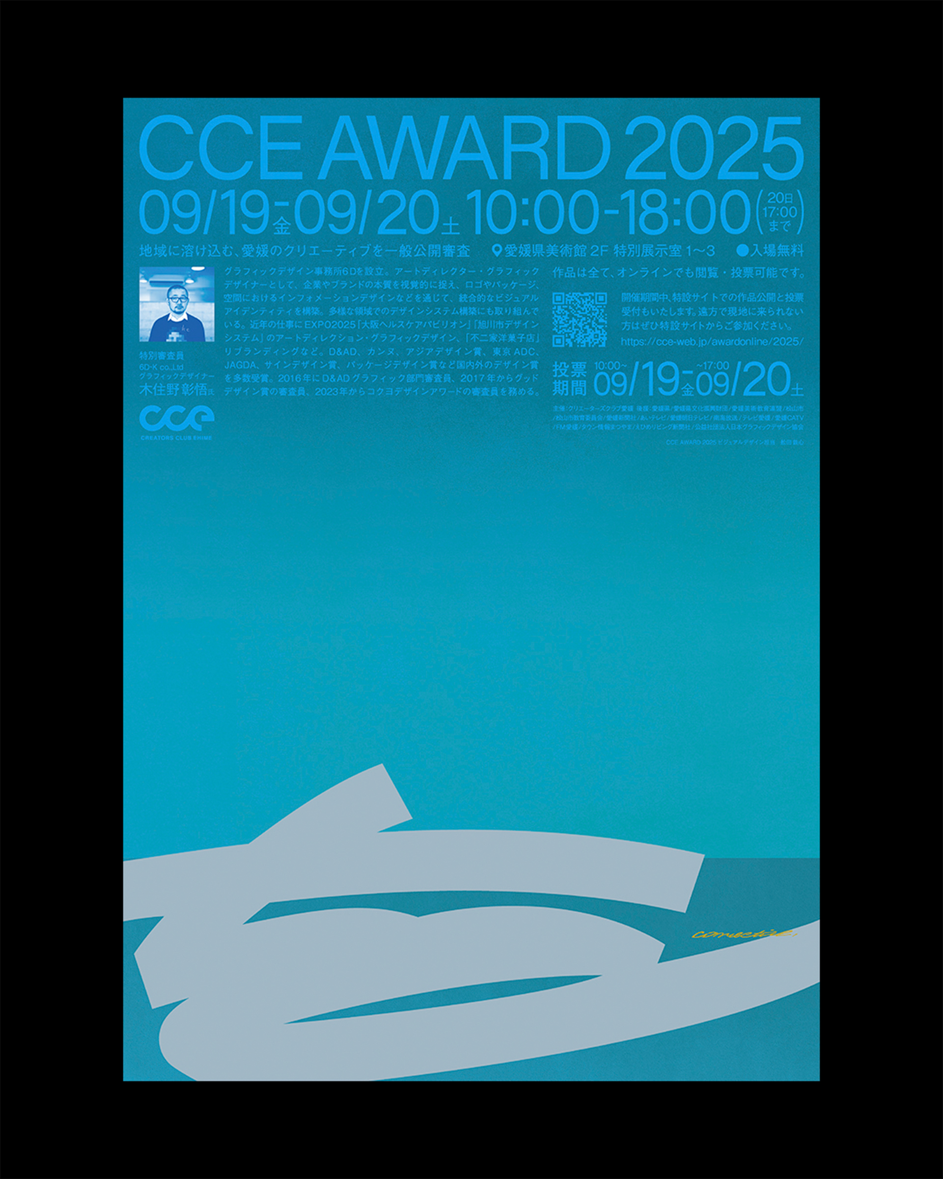 愛媛県内最大級のクリエイター団体「クリエーターズクラブ愛媛(CCE)」が主催するデザインアワード「CCE AWARD 2025」のキービジュアル、表彰状、会場内サインの制作を担当した。