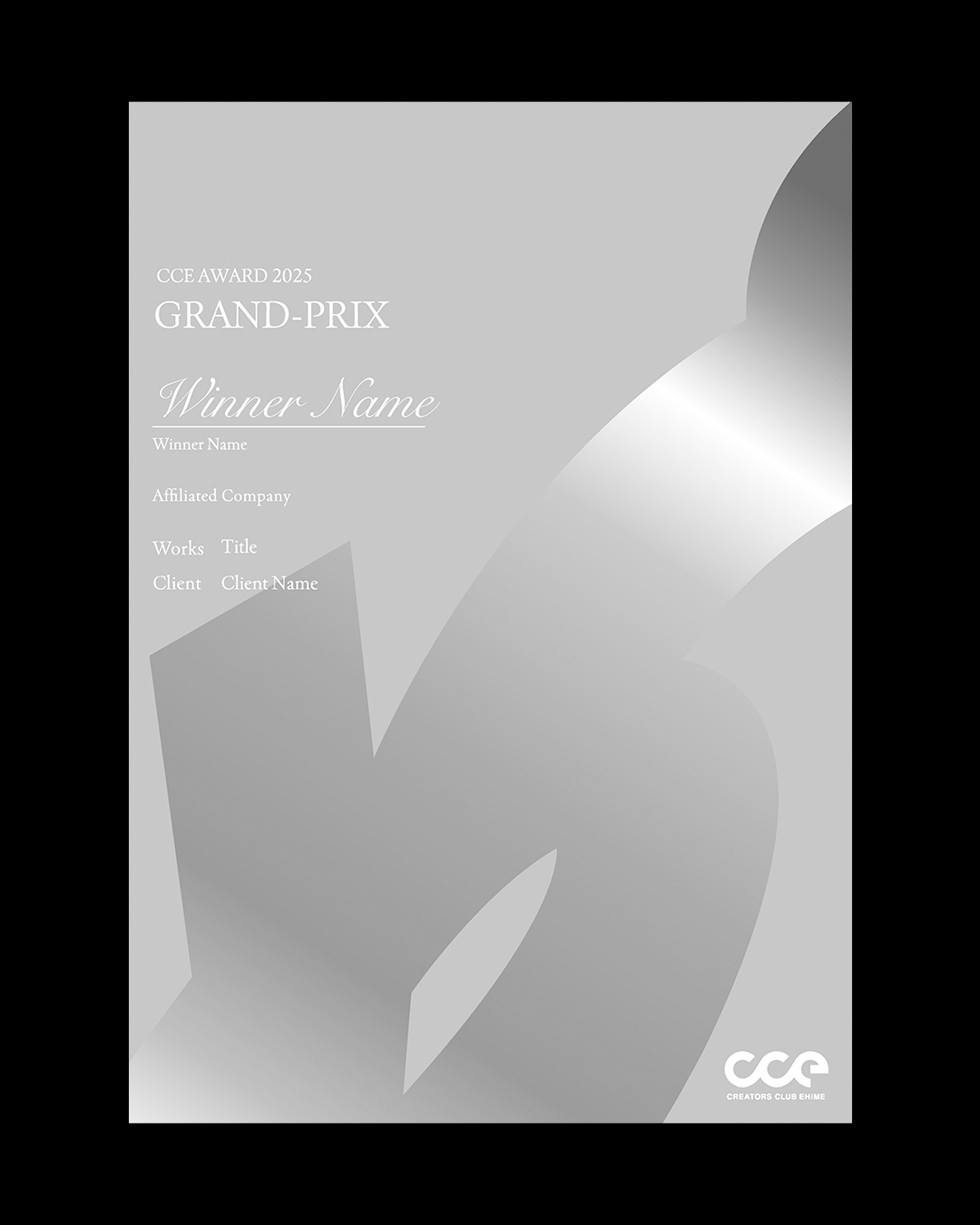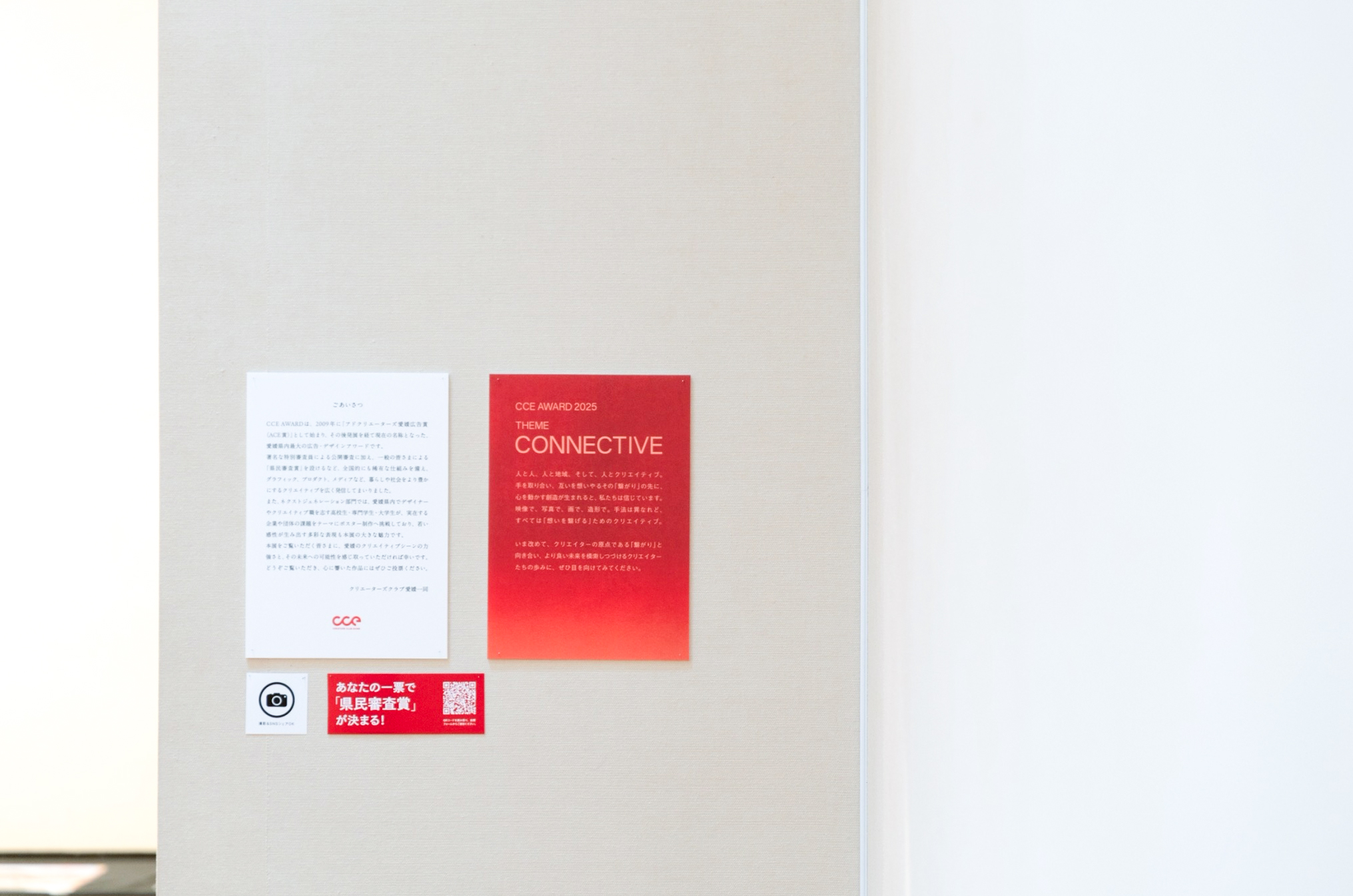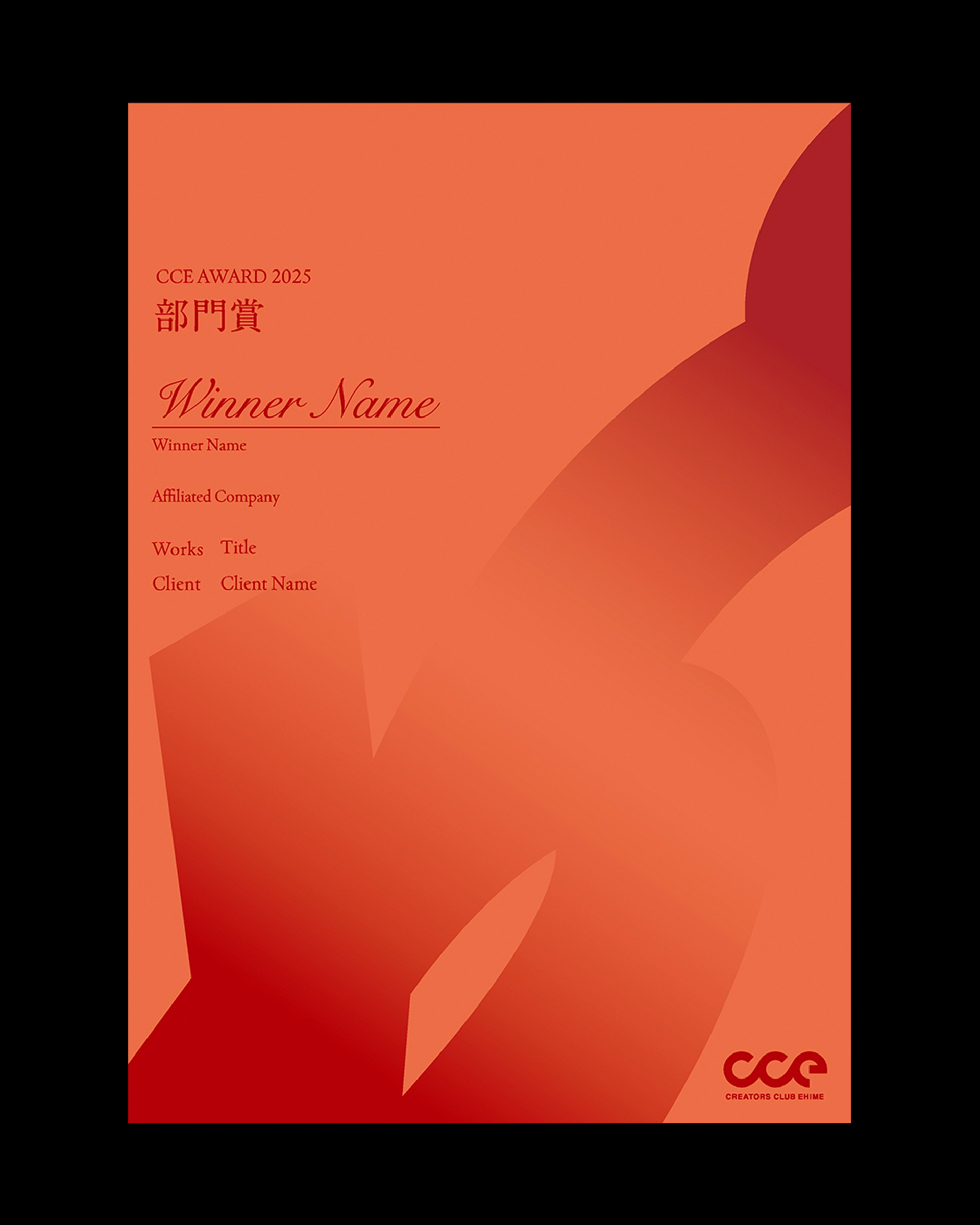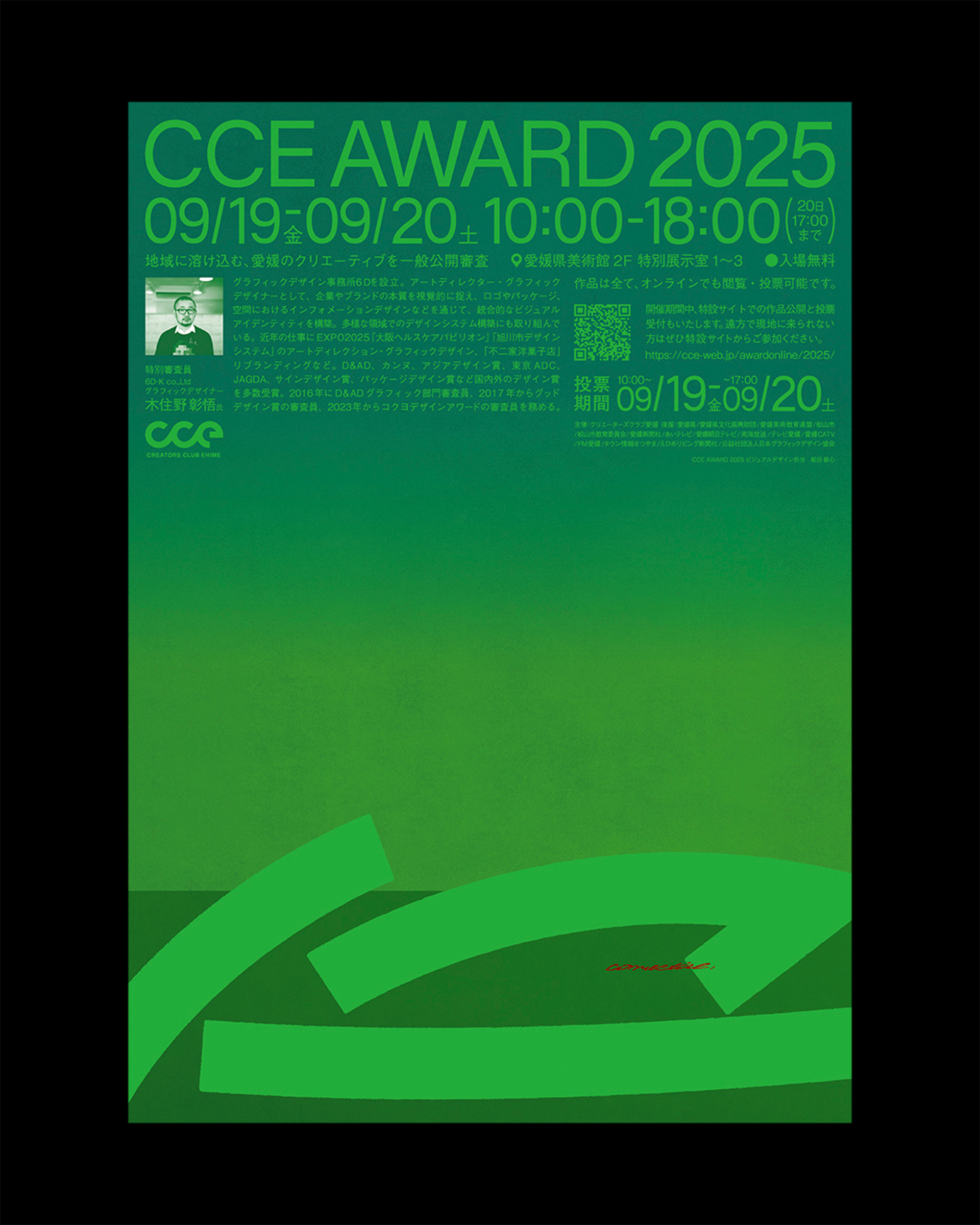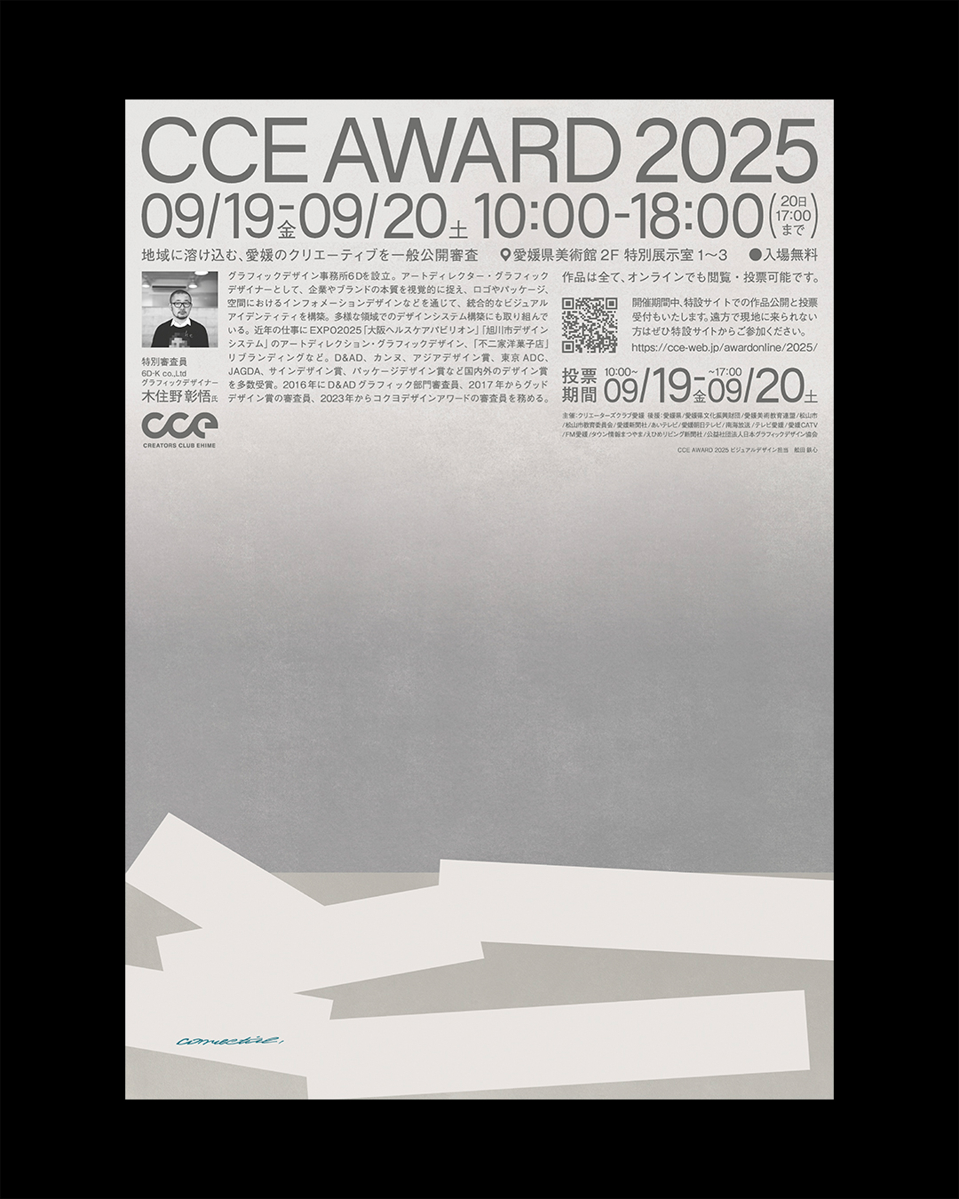 愛媛県内最大級のクリエイター団体「クリエーターズクラブ愛媛(CCE)」が主催するデザインアワード「CCE AWARD 2025」のキービジュアル、表彰状、会場内サインの制作を担当した。