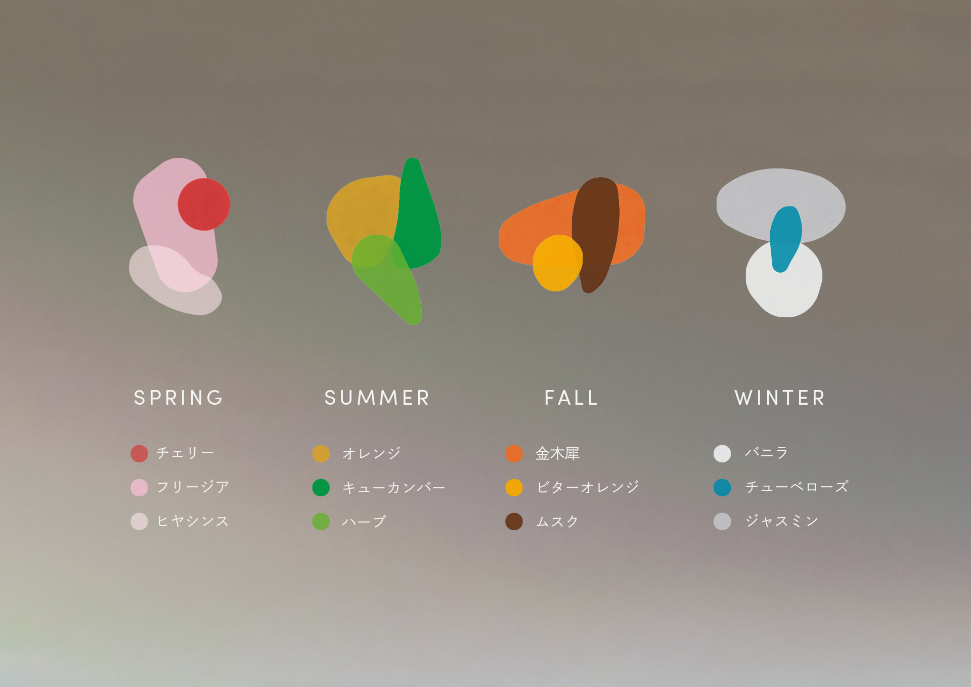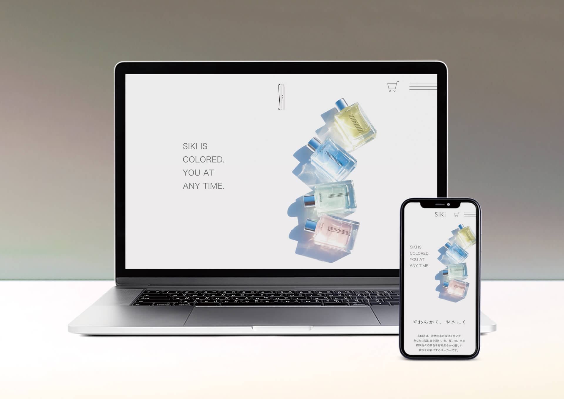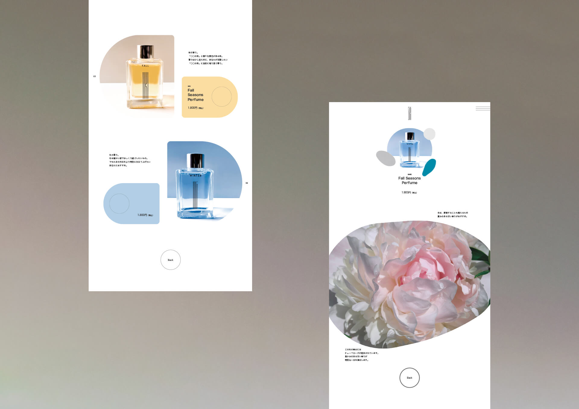 日本から春、夏、秋、冬と四つの季節の香水を販売するメーカー。ボトル、パッケージ、Webサイトまでをデザインし、海外にも視野を広げ、日本の四季の美しさがFour Seasonではなく”SIKI”として世界へ広がるよう意識し制作した。