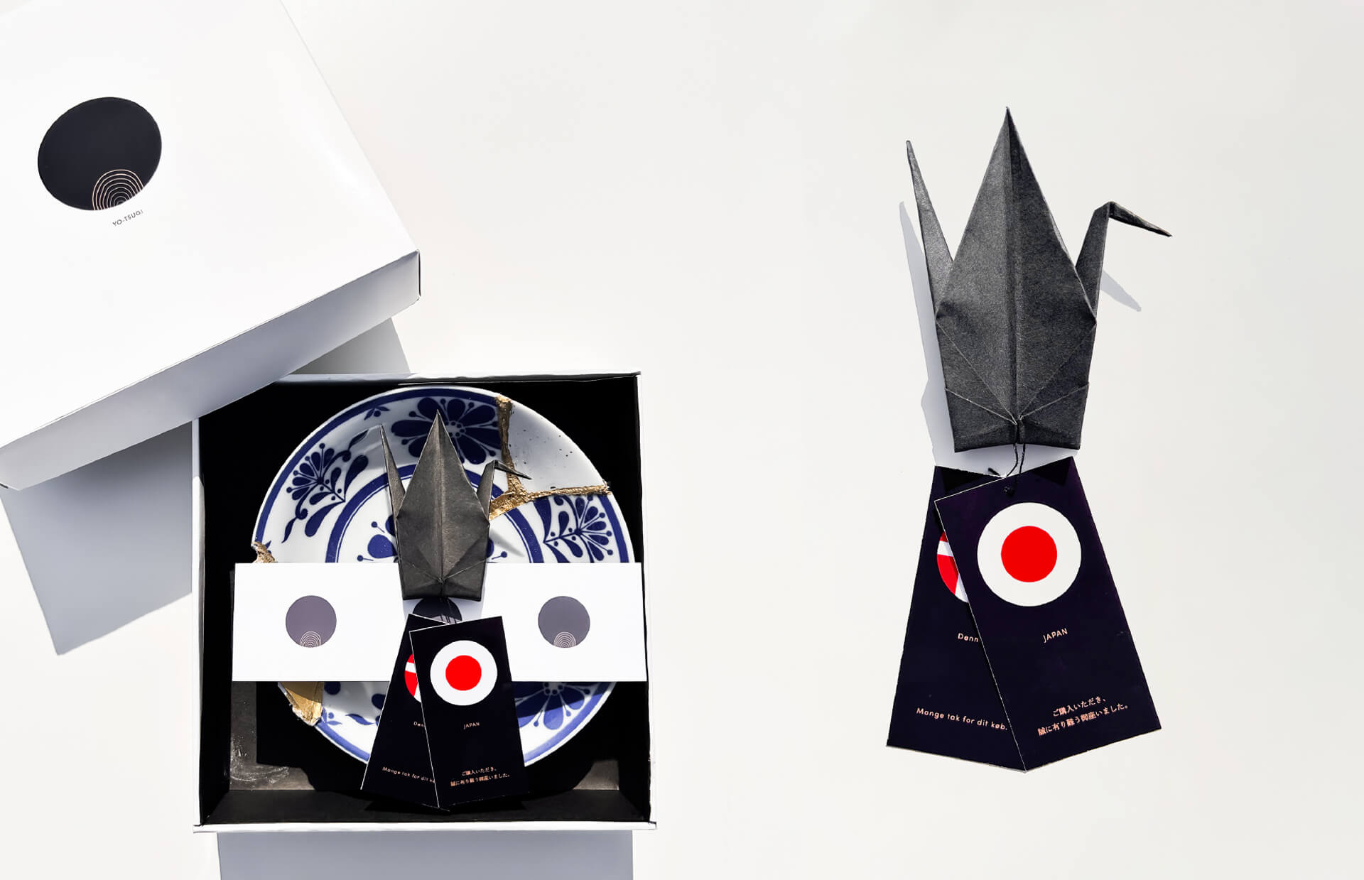 パッケージの中には帯で締めたお皿と、感謝状を同封している。平和を表す鶴の折り紙と、そのお皿を作成するのに使用したそれぞれの国の感謝状のタグを添えている。