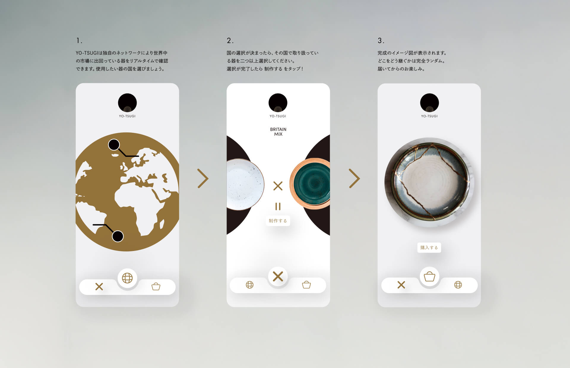 世界にはそれぞれの国の魅力や文化が詰まった器がある。握手をして仲直りしたり、交流を深めるように、異なった文化の器どうしを継ぎ合わせることにより、世界平和の実現を目指す金継ぎメーカー”YO-TSUGI(ヨツギ)”。世を継いでいくブランドを醸成し、パッケージデザイン、アプリケーションを制作した。